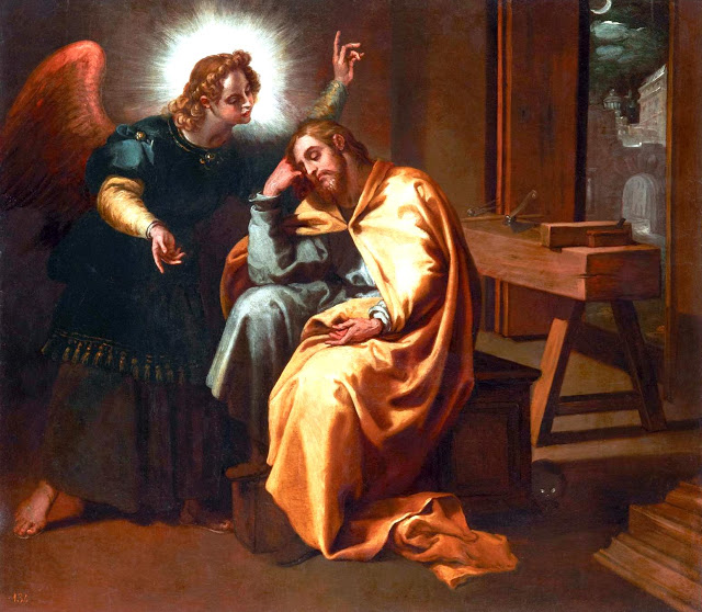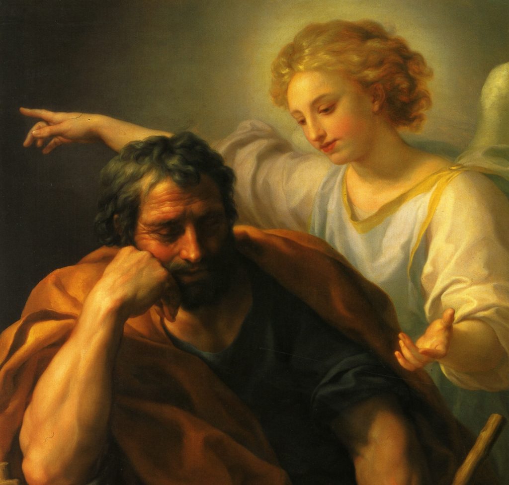 그 확고한 근거란 무엇이었습니까? 유대인들에게 익숙한 ‘꿈’이라는 방식이었습니다. 요셉은 생각하고 있었습니다. ‘생각하다’로 번역한 그리스어 ‘엔씨메오마이’(ἐνθυμέομαι)는 ‘반성하다’, ‘숙고하다’는 의미가 있습니다. 그러니까 요셉의 마음은 어떻게 해야 할지 아직도 정리되지 않았다는 뜻입니다. 정말이지 그는 의심하며 숙고하고 있었습니다. 그러다 잠이 들었습니다. 바로 그 시점에 하느님이 ‘개입’하십니다. 사실 《성경》에서 ‘꿈’은 하느님이 개입하시는 중요한 ‘수단’입니다. 주의 천사는 “다윗의 자손 요셉아”라고 부릅니다. “두려워하지 말고 마리아를 아내로 맞아들이라”고 격려합니다. 한 마디로 하면 “마리아를 포함하여 아기를 너에게 의탁하니 잘 부탁한다”입니다. 정말이지 ‘꿈’은 요셉이 하느님의 뜻과 계획에 반하여 자신의 뜻과 계획을 수행하는 것을 막는 하느님의 거룩한 개입이었습니다.