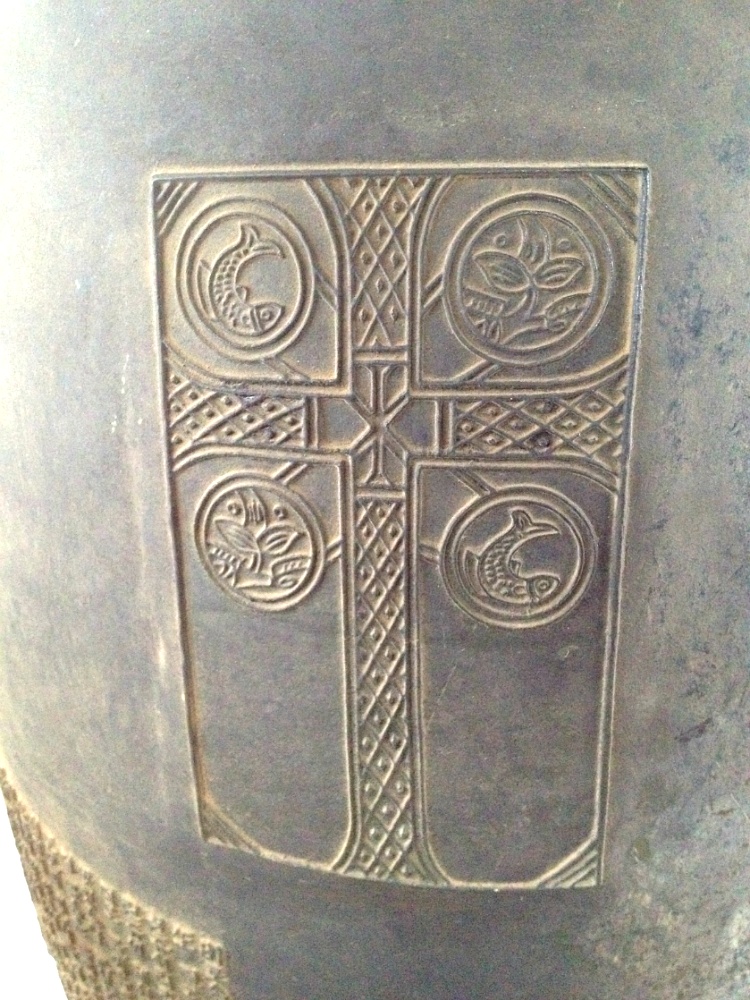 교회종이라고 하기엔, 너무나 범종에 가깝습니다. 종을 치는 자리에는 성공회를 의미하는 둥근 십자가 문양이 있습니다. 종 상단에는 영국식 켈틱 십자가 문양에 물고기와 포도나무 가지(?)를 새겨넣었습니다. 그리고, 불경을 새겨넣듯, 요한복음 1장 말씀을 새겨넣었죠.