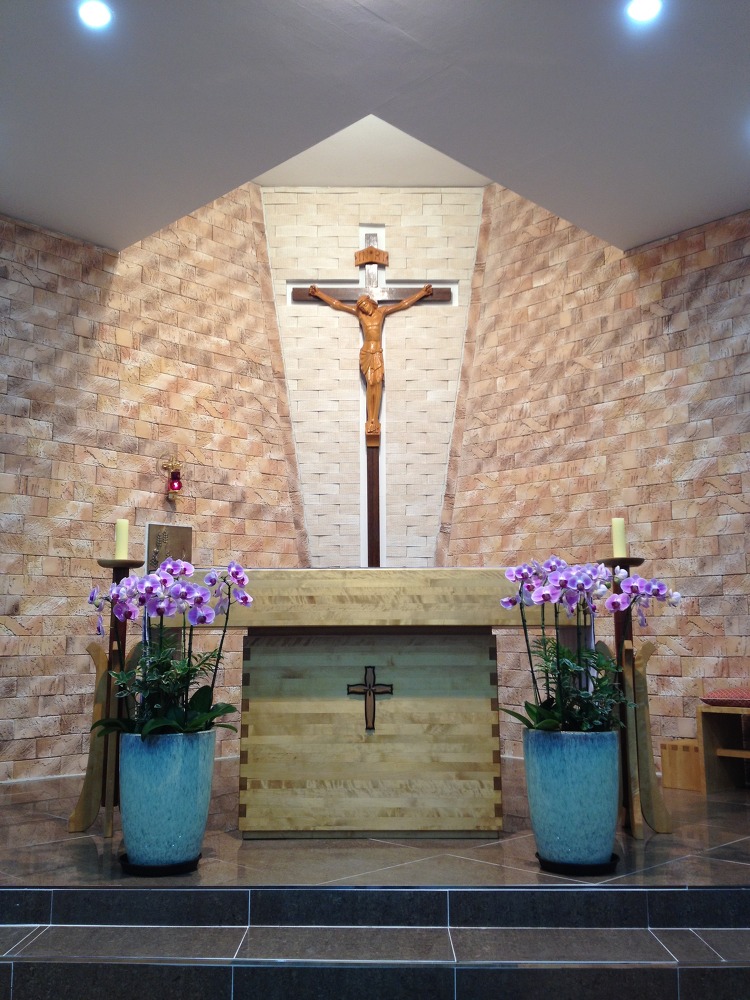 세례단과 신자석 너머에 제대를 모신 지성소가 있습니다. 제대는 고전적으로 앞쪽을 향해 있어서, 신부님이 평신도를 등지고 집전한답니다. 지금은 그런 성당이 몇 없을 겁니다. 여기는 여전히 옛날과 같이 앞을 보고 감사성찬례를 드린답니다.