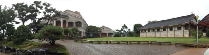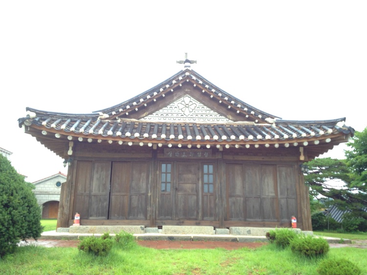 찍은 각도는 제대가 있는 앞쪽에서 찍은 것이라, 성당에 들어서는 입구는 여기서 보이지 않습니다. 건물의 전체적인 모습을 다 담으려고 해봤지만, 아쉽게도 지붕 위에 올린 강화읍성당의 독특한 십자가는 들어와 있지를 않네요. 강화읍성당은 좀 높은 곳에 위치해있습니다. 땅모양까지 감안하면 전체적인 모습은 노아의 방주를 상징하는 형상이라고 합니다. 저는 저 청록색 문짝이 신기했습니다. 분명 한옥이지만, 문은 유럽에서나 보암직한 모양새라는 생각이 듭니다. 강화읍성당은 영국인들의 손으로 지어졌습니다. 뒤에 소개하겠지만, 조선의 성공회교인들이 지은 최초의 성당은 온수리 성 안드레 성당입니다.
