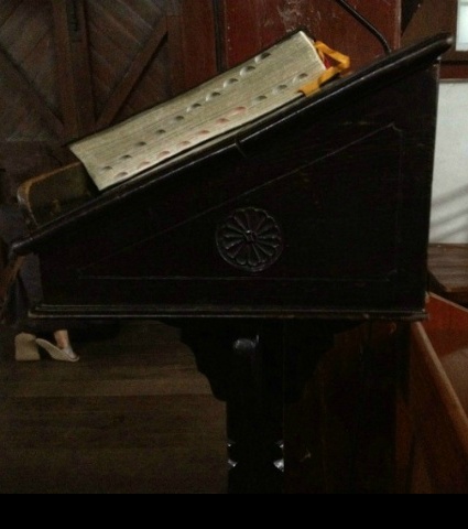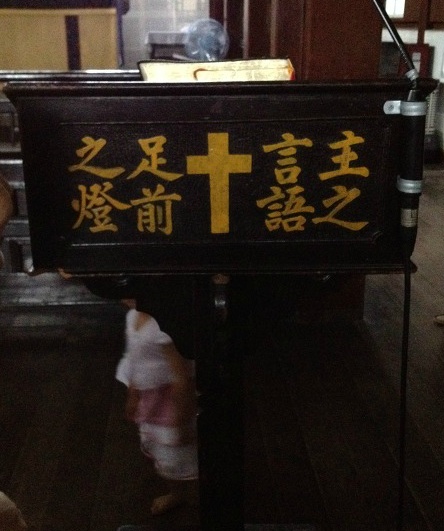감사성찬례 시간 중 성서정과 말씀을 읽는 독서대입니다. 한자로 “주의 말씀은 내 발의 등이요”라 씌여 있습니다. 이 독서대에는 가슴 아픈 우리 민족의 역사가 스며있기도 합니다. 독서대 좌우에는 일본황실을 상징하는 꽃문양이 새겨져 있습니다. 일제강점기에 만들어져서 그렇습니다.