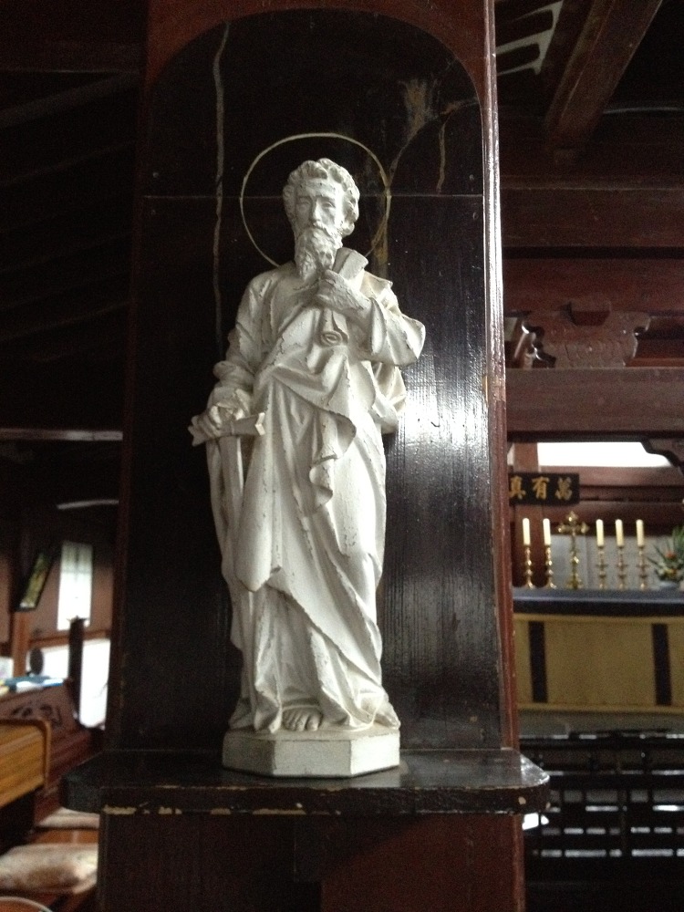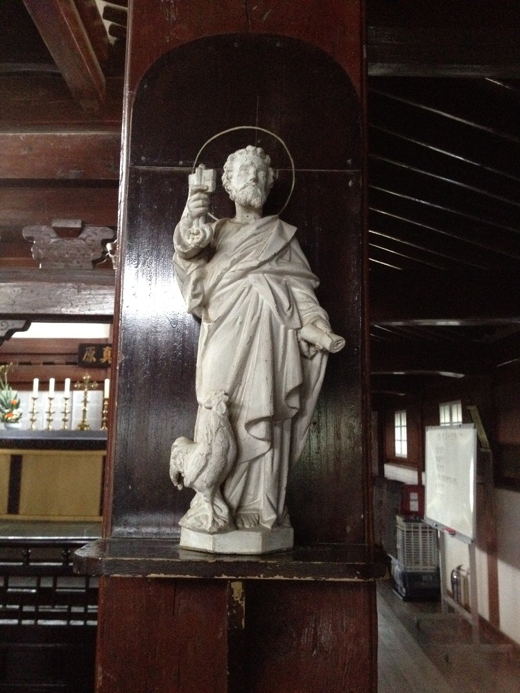 강화읍성당의 수호성인인 베드로와 바울로입니다. 바울로는 하느님의 말씀을 상징하는 검을 손에 쥐고 있고, 베드로는 천국의 열쇠를 손에 쥔채, 닭 한 마리와 함께 서 있습니다. 베드로가 닭과 사연이 있는 건 다 아실테죠.