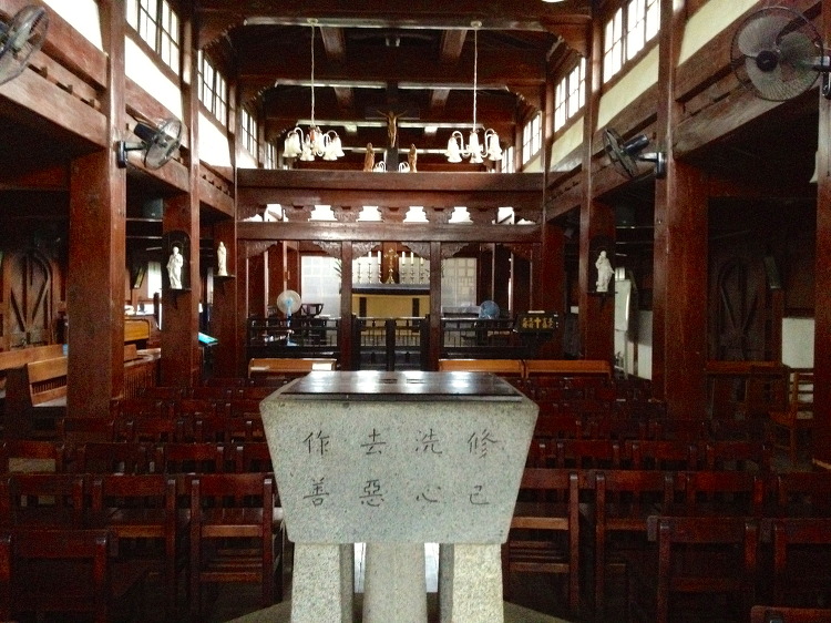 성당 내부는 바실리카 양식을 한옥으로 구성한 모습입니다. 들어서자마자 떡하니 버티고 있는 저것은 세례식을 거행할 때 사용하는 성수단입니다. 성수단에는 “修己洗心去惡作善”이라 새겨져 있습니다. 저는 ‘자신을 수양하고 마음을 단정히 하여 악을 쫓고 선을 이루라.’고 풀이를 했는데, 맞는지는 모르겠습니다. “洗心”을 어떻게 풀이해야 할지 몰라서… 신부님 말씀으로는 세례의 의미를 담은 구절이라고 하시더라구요.